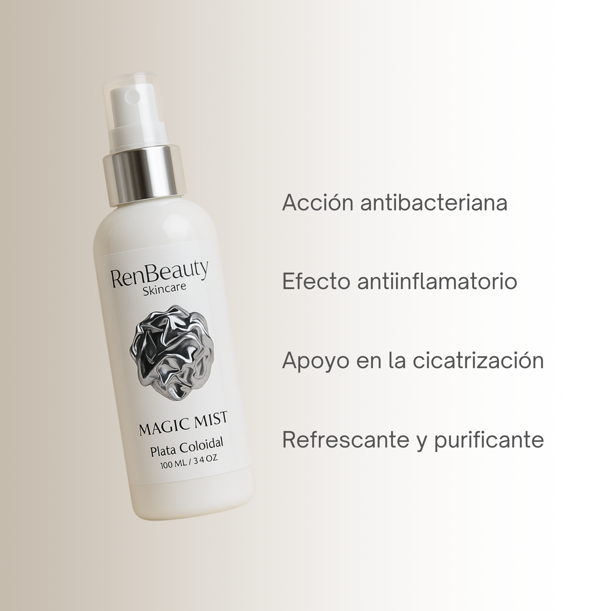 Bruma facial antibacteriana con plata coloidal. Refresca, purifica y ayuda a mantener la piel limpia y protegida de impurezas, ideal para piel propensa al acné o en momentos donde necesitas una higiene extra.